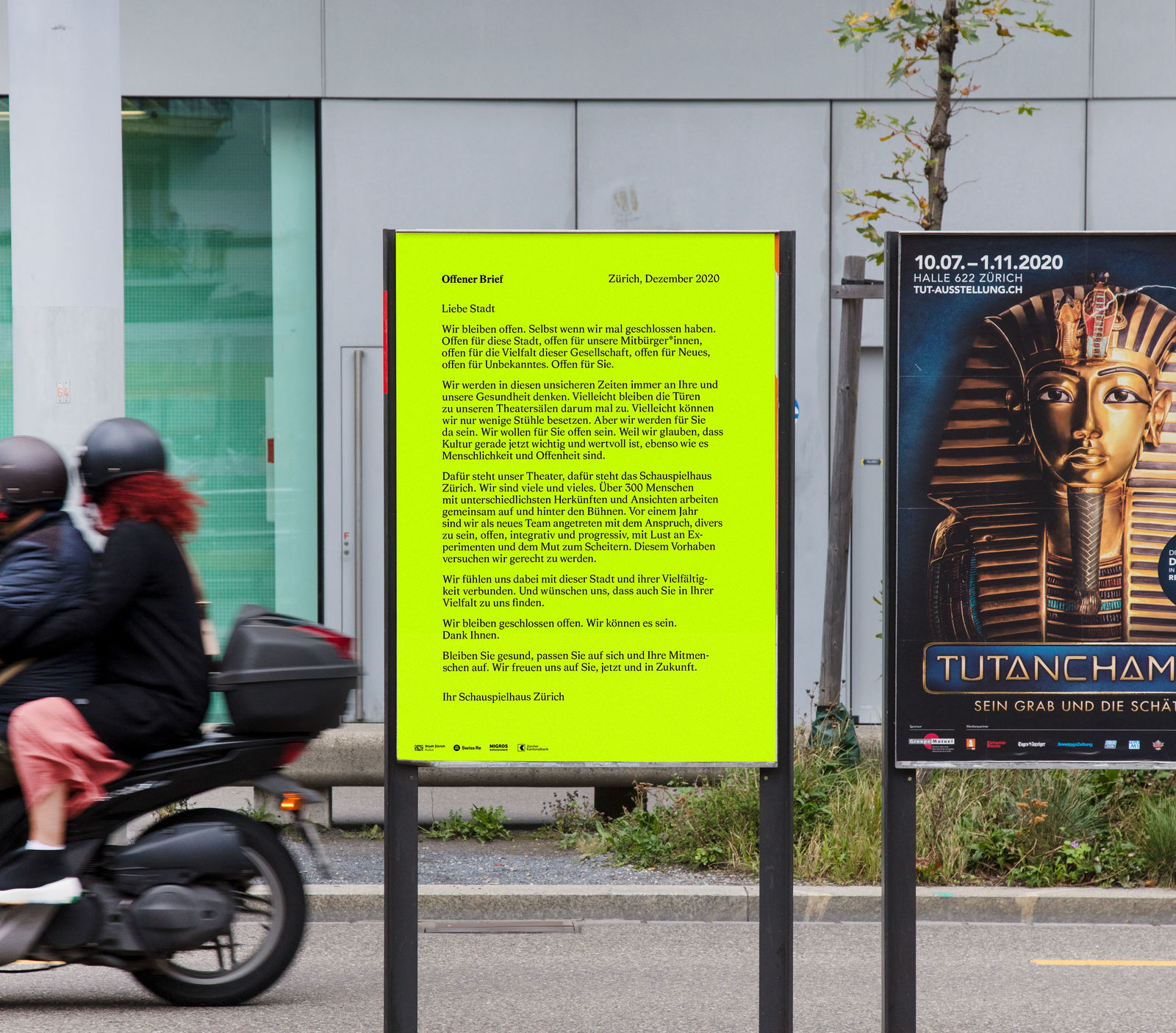Seit Samstag, 12. Dezember finden im Schauspielhaus Zürich aufgrund des Bundesrats-Entscheid keine Vorstellungen mit Publikum mehr statt. Das Theater wird die Live-Streams fortsetzen, bei denen die Regisseure und Regisseurinnen die Bildregie selbst steuern. Gleichzeitig wurde die Kampagne “geschlossen offen” lanciert: mit einem offenen Brief an die Stadt, der das Engagement des Theaters für Offenheit, Vielfalt und Experimentierfreudigkeit zum Ausdruck bringt.
